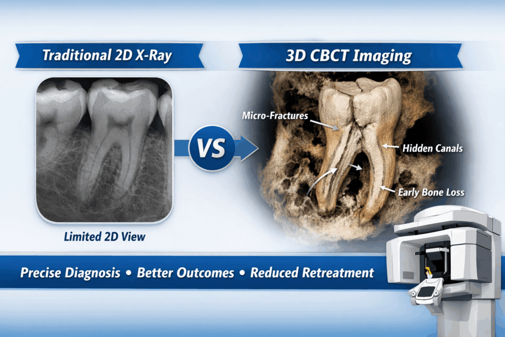 Traditional X-rays only give a 2D image of a tooth. They do not provide complete information about hidden infections and the complete root canal morphology.